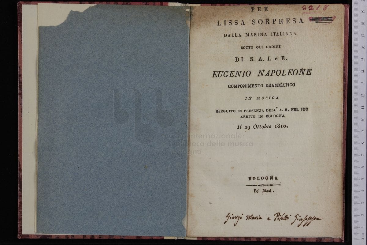 "Per Lissa sorpresa dalla Marina italiana sotto gli ordini di S.A.I. e R. Eugenio Napoleone". Libretto del cavalier Giusti.